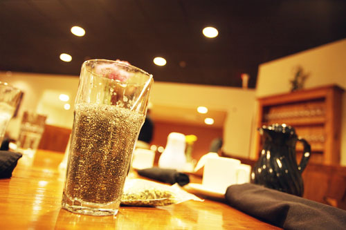 We stayed at a hotel with my parents recently…and I knew the only thing I would want to eat at their restaurant would be fruit. So I kicked it up a notch and brought a little baggie of chia with me. I asked the waiter for a glass of water without ice, dumped in the chia seeds, stirred and waited. In about 10 minutes, I had a nutritious breakfast packed with vitamins and goodness. I dumped it into a bowl, added some fruit and honey to the top and I was a happy girl!!